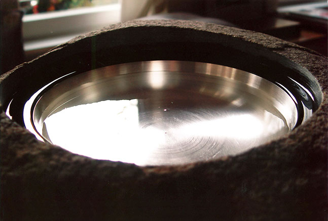 Für das Wasserbecken wählte ich einen Stein von dichtem porphyrischen Gefüge. Er kommt als Findling in Lehmgruben vor, wo der im Kern dunkelgrüne Stein, der Diabas genannt wird, eine bräunliche Mineralrinde ansetzt. Die Größe und die Form des Steins sind Vorgaben für die Ausmaße der Kuhle, die der Stein zulässt. Auf die mit Wasser gefüllte Kuh le wird die Metallschale mit dem Loch aufgesetzt. Um ungehindert darin zu schwimmen, ist ein etwa zwei Finger breiter Abstand zum Rand des Steins erforderlich. Die Größe des Loches sowie das Gewicht der Schale sind für die Zeitmessung entscheidend. Ihre Dimensionen wie auch das angestrebte Ziel von einer Stunde Laufzeit, sind das Ergebnis empirischer Ermittlungen.