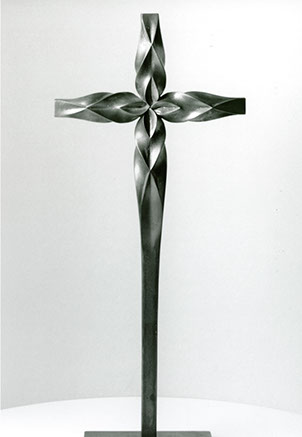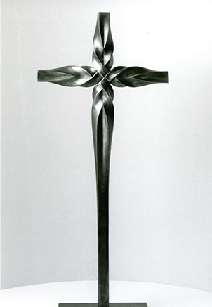 Um sich ein Bild zu machen, muss man sich vorstellen, dass die Vierkantbalken des Kreuzes (wie in der Medizin) gegen die Fasen „seziert“ wenden. Die entstehenden Schnittflächen sind Quadrate, die von einer Achse (wie von einem Rückgrat) zusammengehalten werden. Auf diese Weise ist der Vierkant verformbar. Durch systematische schrittweise Verdrehung der Quadrate in Links- und rechtsseitige Richtung um die Achse werden die geradlinigen Kanten zu Kurven: Die ursprünglich starrer Form „öffnet“ sich. Durch die gegenseitige Verschneidung (links-rechtsdrehend) kommen neue Formen zum Vorschein: offensichtliche Formen, die anwesend waren, jetzt frei geworden sind – Sektion + Rotation; ohne Hinzufügen oder Wegnehmen irgendeines Bestandteils und insbesondere ohne Deformatoinspathos ….